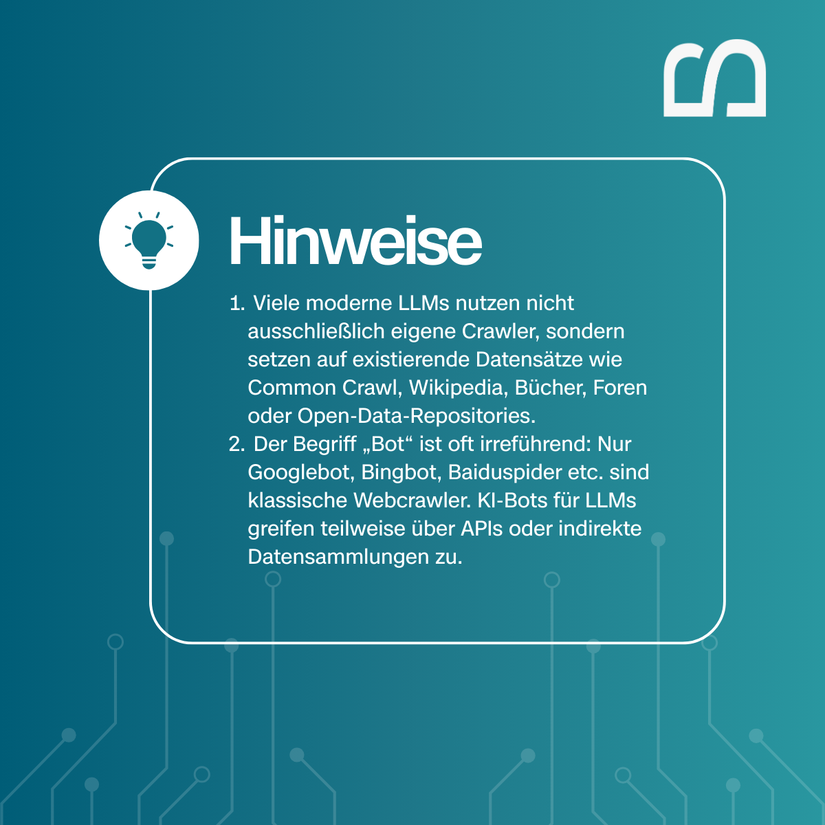 Viele glauben, dass ein einziger Webcrawler das komplette Internet scannt. Doch in Wirklichkeit gibt es unzählige Webcrawler, manche sammeln Daten für KI-Trainings, andere ermöglichen LLM-Browsing oder sorgen für die klassische Indexierung in Suchmaschinen.