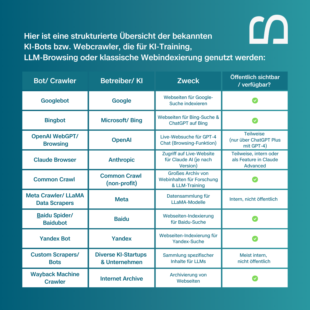 Hier ein Überblick über die wichtigsten KI-Bots bzw. Webcrawler: